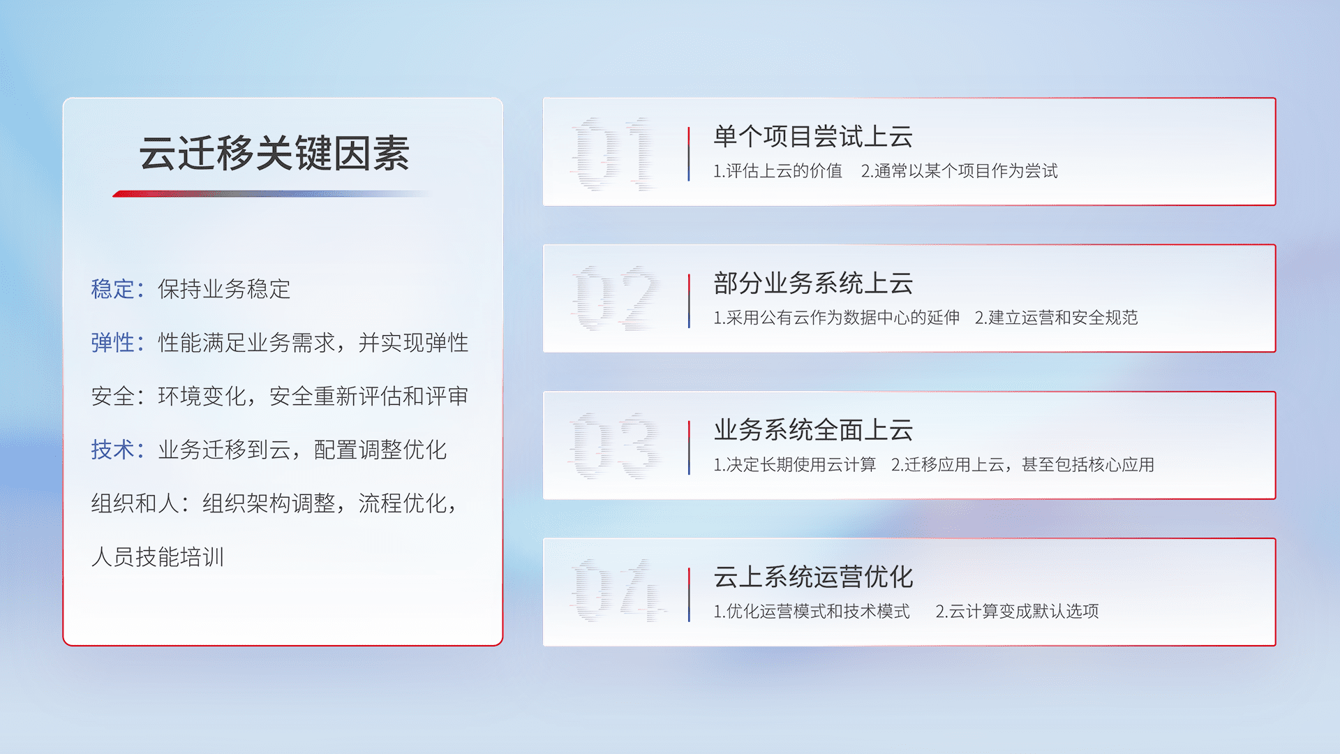 结合实际业务,,,,从规划设计、、、、云平台选型、、、、云原生改造、、数据迁移、、、、集成交付,,,迁移全过程为客户识别最佳上云路径,,,,做好风险识别管理,,设计网络架构、、、、身份权限、、、、安全审计合规、、、操作审计、、、日志审计、、、监控告警策略、、多站点容灾设计等,,,对云上基础设施进行整体规划,,提升IT治理水平,,,,以满足弹性、、、、高可用、、、、高性能的需求。。。