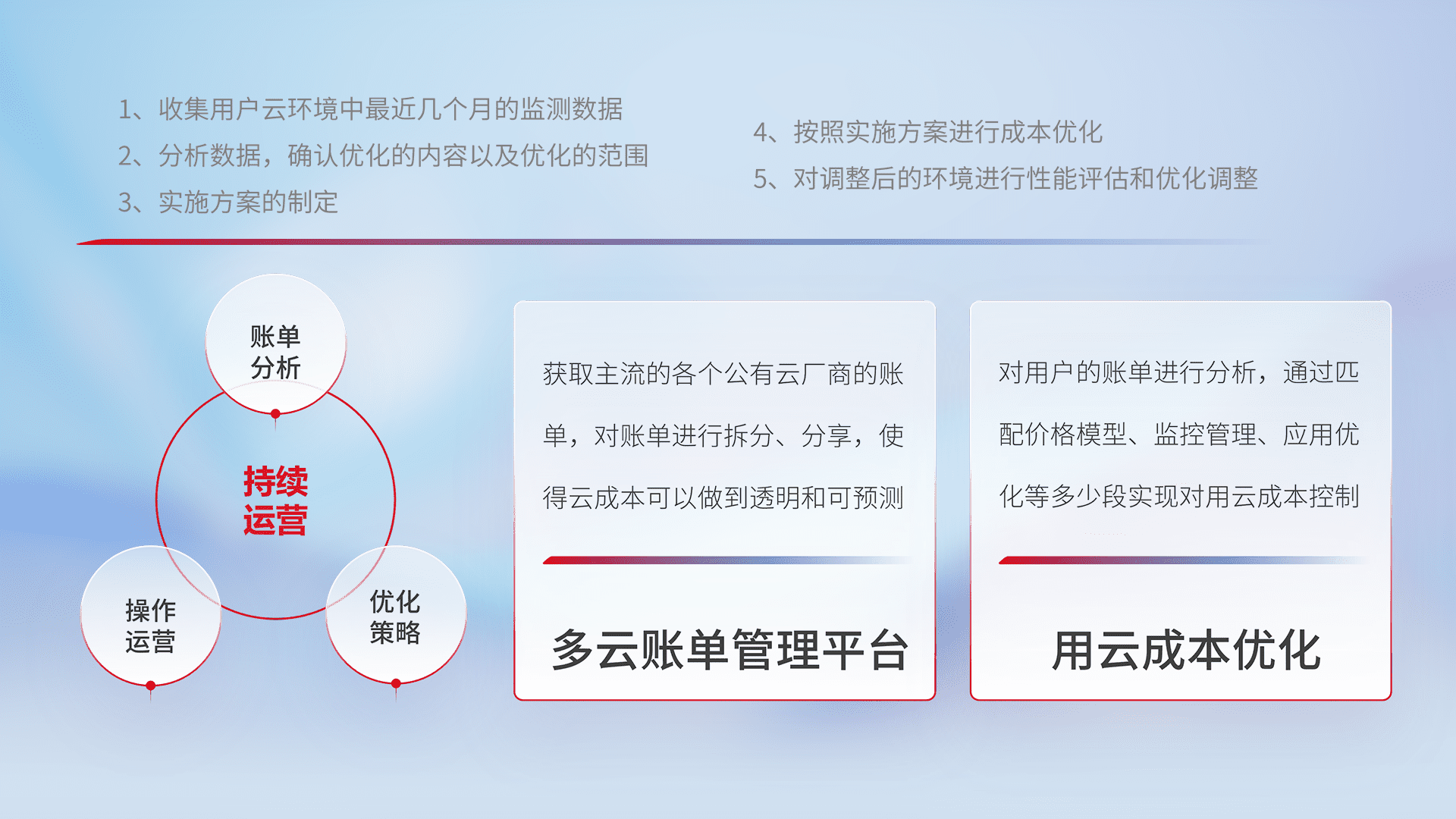 通过多云纳管,,,以统一的资源数据模型把客户的云资源进行抽象和封装,,,进而实现对多云资源的统一操作,,保障云资源管理的可靠性、、稳定性与可用性。。。。量身定制化运维内容,,配置、、开发运维、、、补丁管理、、备份、、、、监控、、认证和访问管理、、、审计和日常巡检等,,,保障在用云过程中的可靠度,,稳定度以及高可用率。。。。