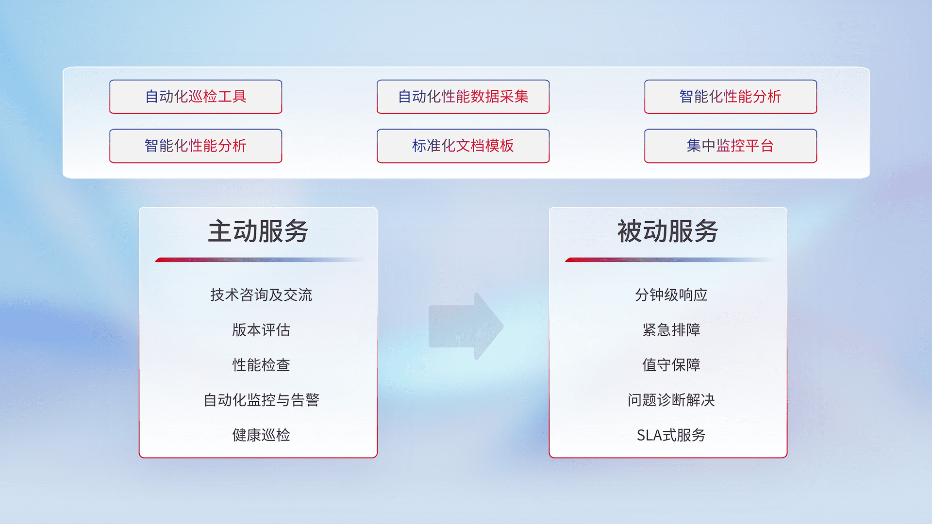 智能化工具和标准化文档,,保障服务质量,,提供主动服务(包含技术咨询、、、、版本评估、、、性能检查、、、自动化监控与告警、、、健康巡检)和被动服务包含(分钟级响应、、、、紧急排障、、值守保障、、、、问题诊断解决、、、SLA服务)。。。。